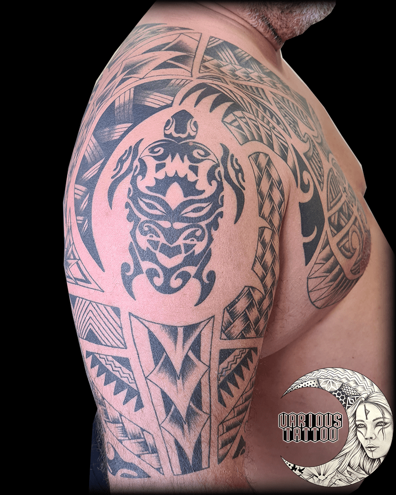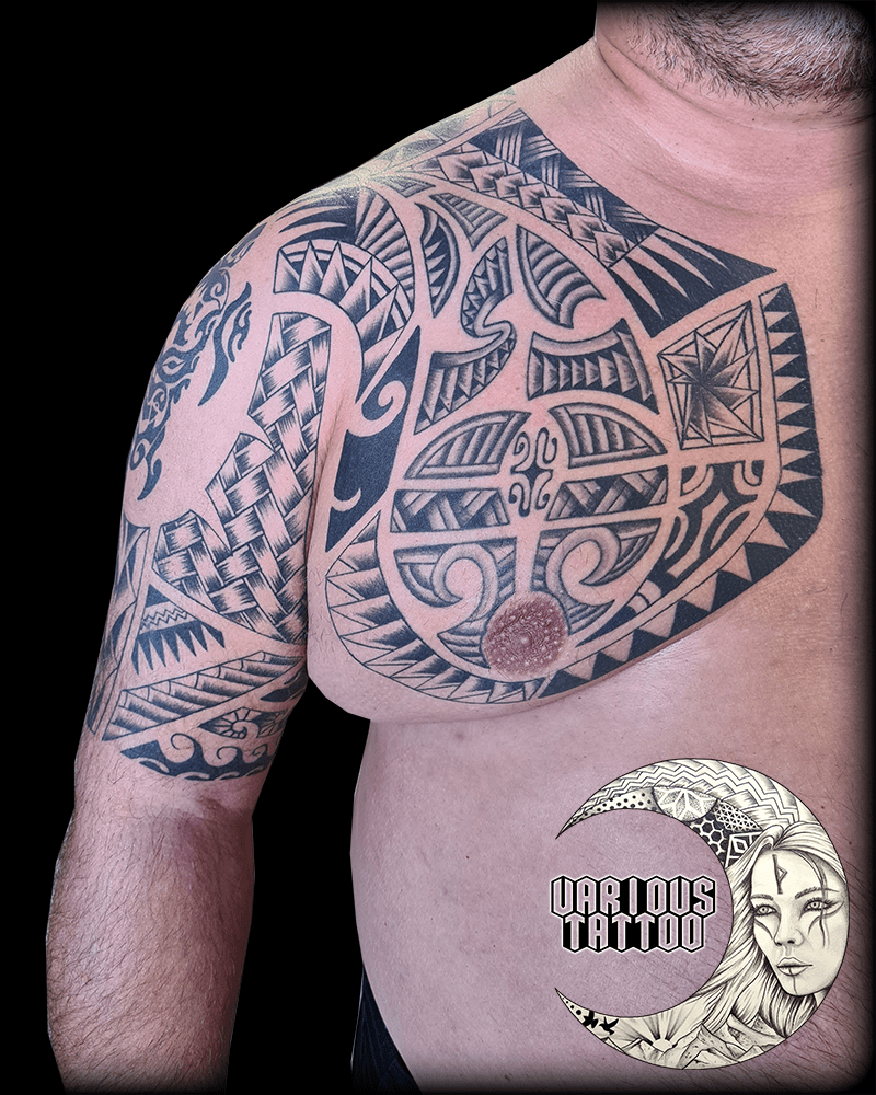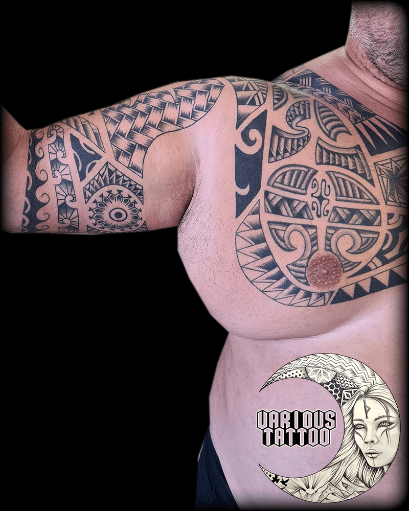 Immersion totale dans la culture polynésienne avec ce projet d’envergure qui s’adapte aux courbes naturelles de l’anatomie. Un travail de composition complexe pour lier harmonieusement le dos, l’épaule et le pectoral. 🌀✨