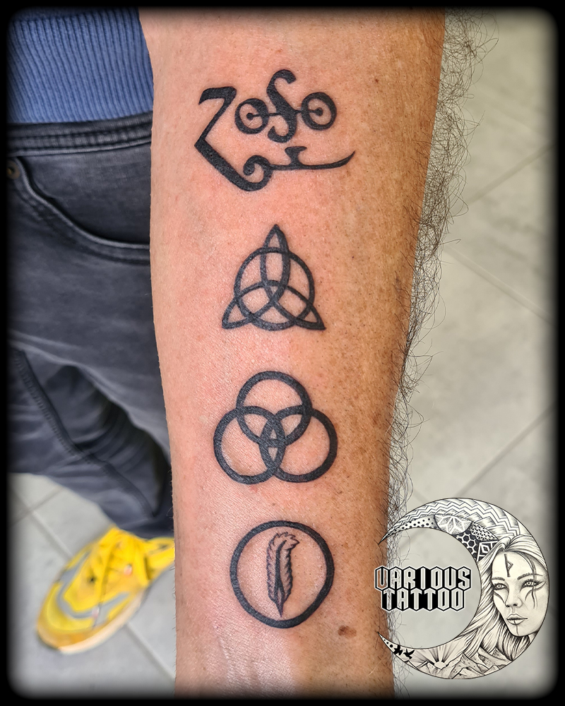 On ne présente plus ces quatre symboles légendaires ! J’ai eu le plaisir de réaliser ce superbe tatouage en linework précis sur l’avant-bras d’un passionné de rock. Un véritable hommage à l’un des plus grands groupes de l’histoire de la musique, gravé pour toujours. C’est propre, c’est puissant et c’est intemporel. 💪