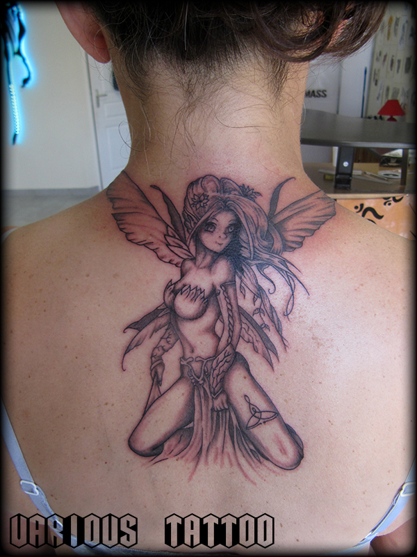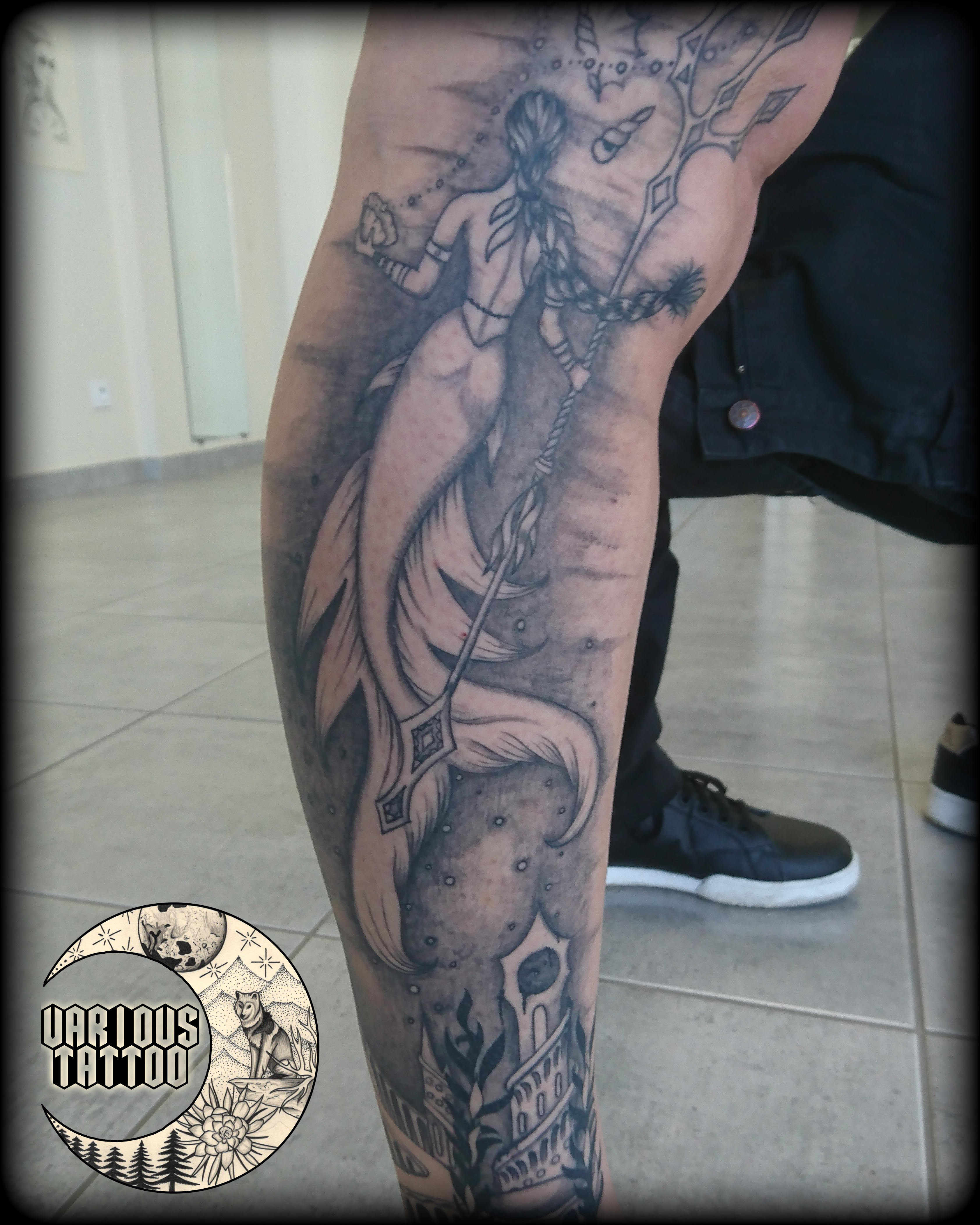 Jambe entière Sirène, représentant sa famille avec la sirène en guise d’ange gardien (tatouage cicatrisé)